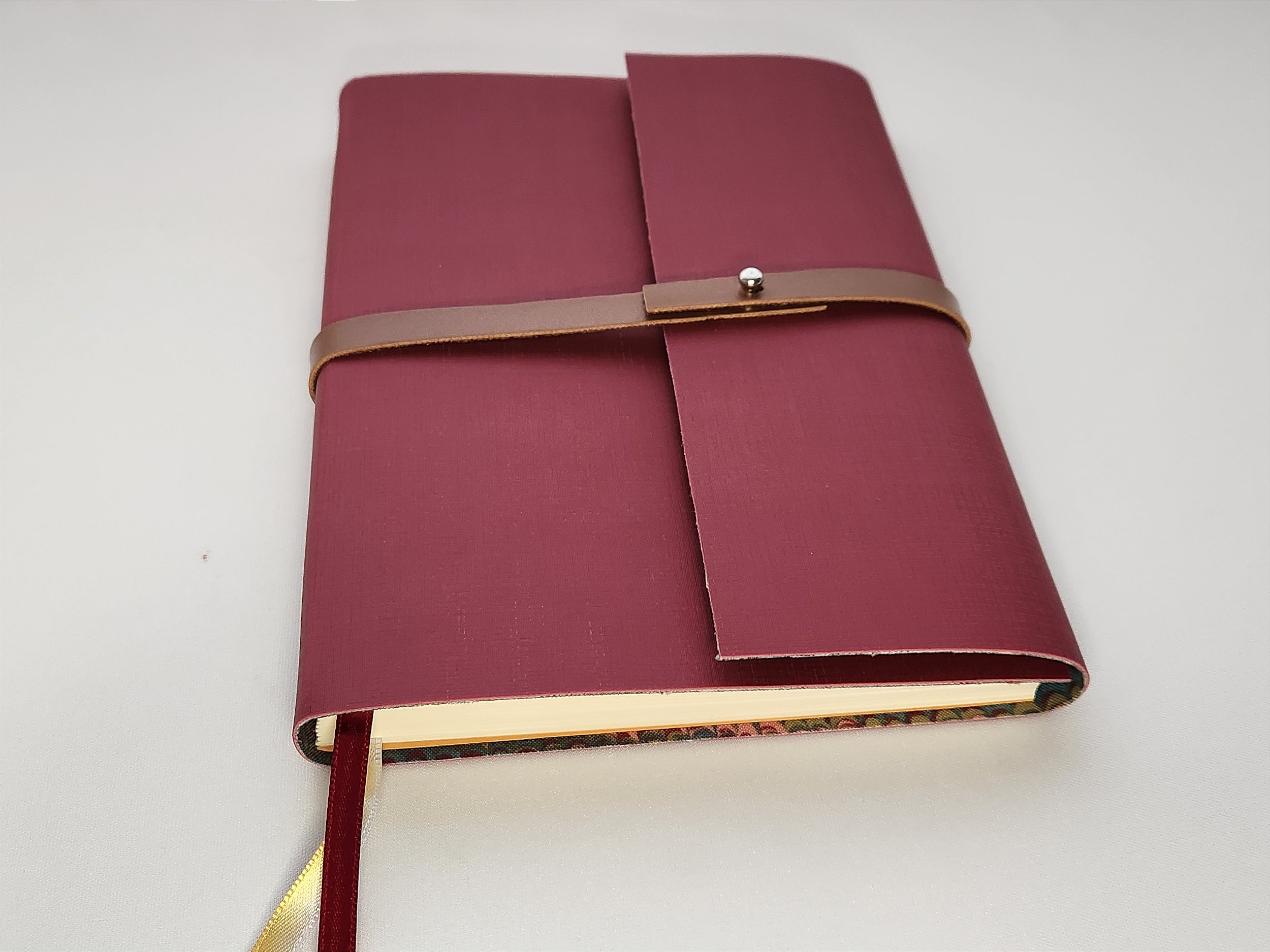 Capa em material sintético na cor vinho e tecido colorido por dentro.