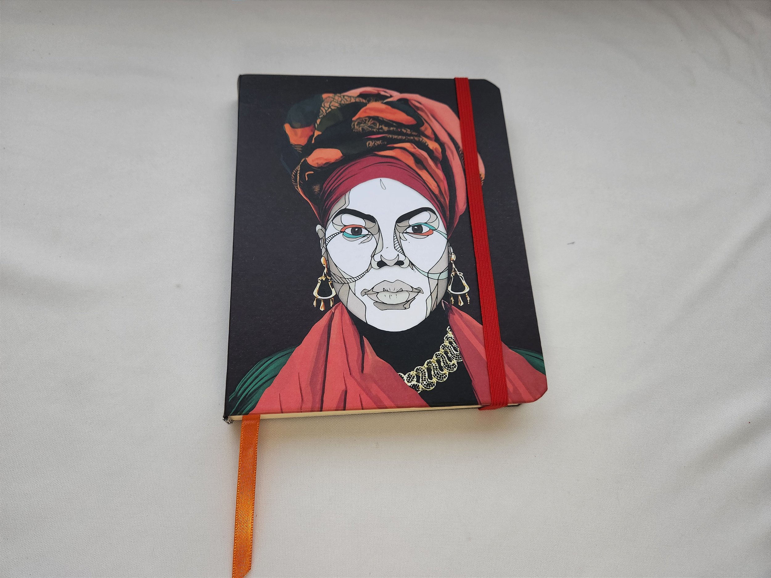 Sketchbook ilustração Queen Latifah do artista Rads encadernação, com abertura 180 graus, excelente para desenhos e rascunhos. Feito com capa dura revestida com o print da arte, interior em papel pólen, que é excelente para uso de grafite, canetas, tinta e marcadores.